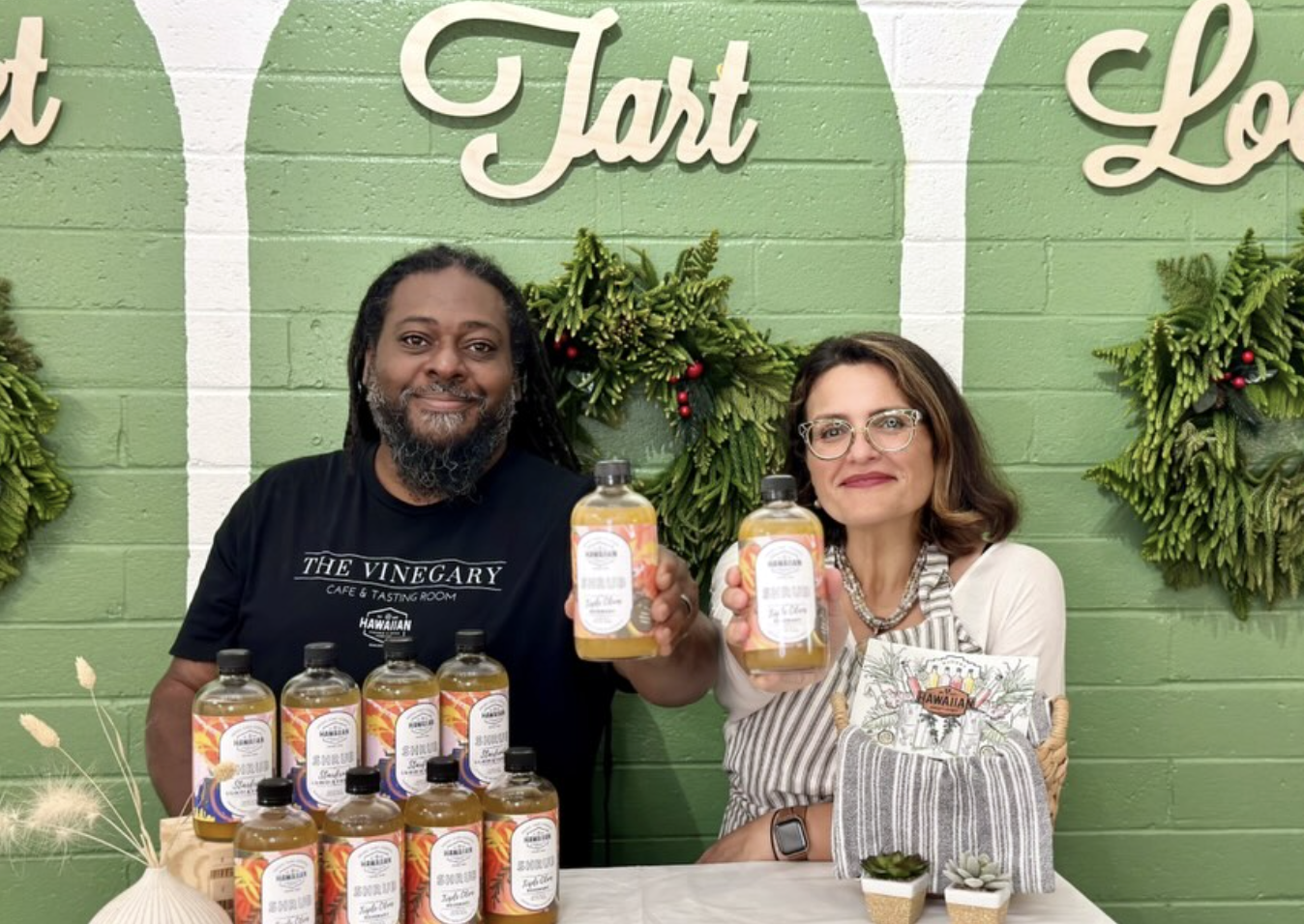 In 2018, Hawaiian Vinegar Company was officially established. The mission was to connect with farmers before their “opala” (trash) went to feed. “My first competitors were chickens and pigs,” jokes Brandon. The first vinegar he made was from tangerines. “We were driving down our street one stormy, rainy day, and there were two girls on the corner that had a table with a box of tangerines for sale from their tree. We bought them all.” He juiced the fruit, and lo and behold, nature took over and he didn’t even have to add yeast.